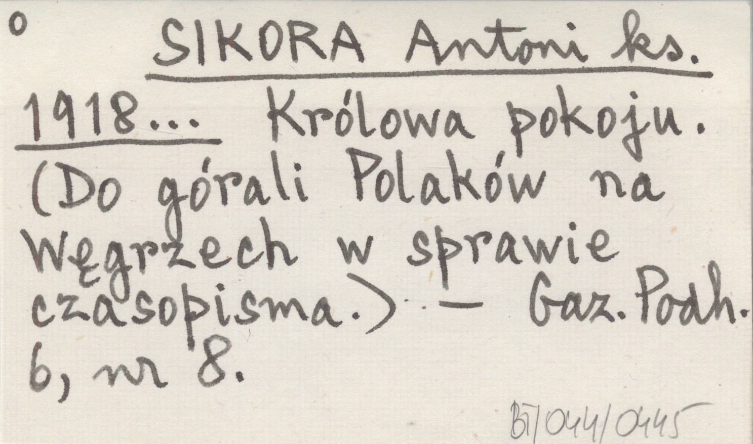 SIKORA Antoni ks. 1918... Królowa pokoju. (Do górali Polaków na Węgrzech w sprawie czasopisma).