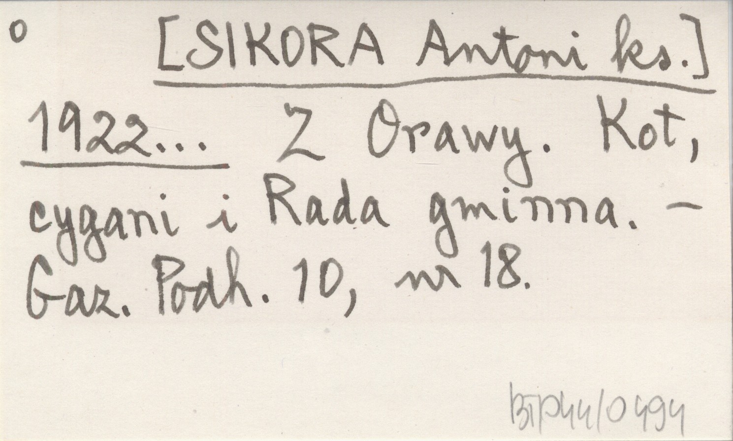[SIKORA Antoni ks.] 1922... Z Orawy. Kot, cygani i Rada gminna.
