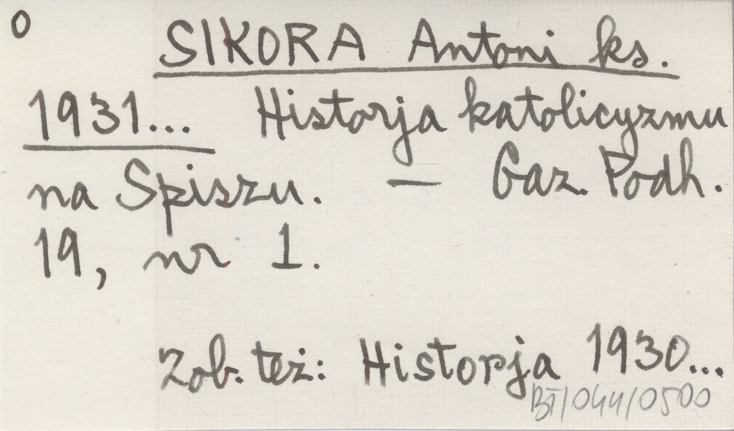 SIKORA Antoni ks. 1931... Historja katolicyzmu na Spiszu.