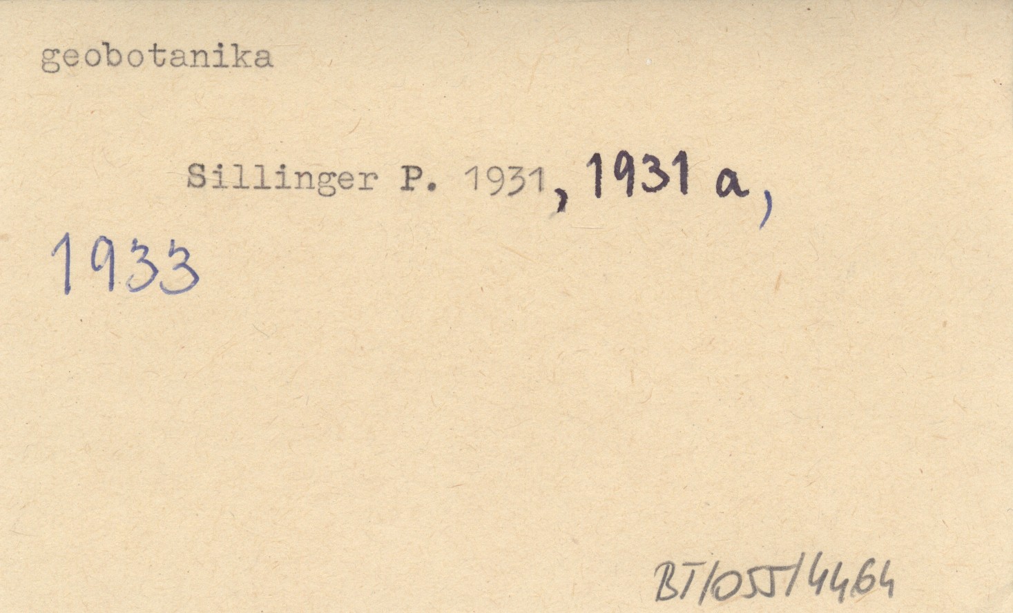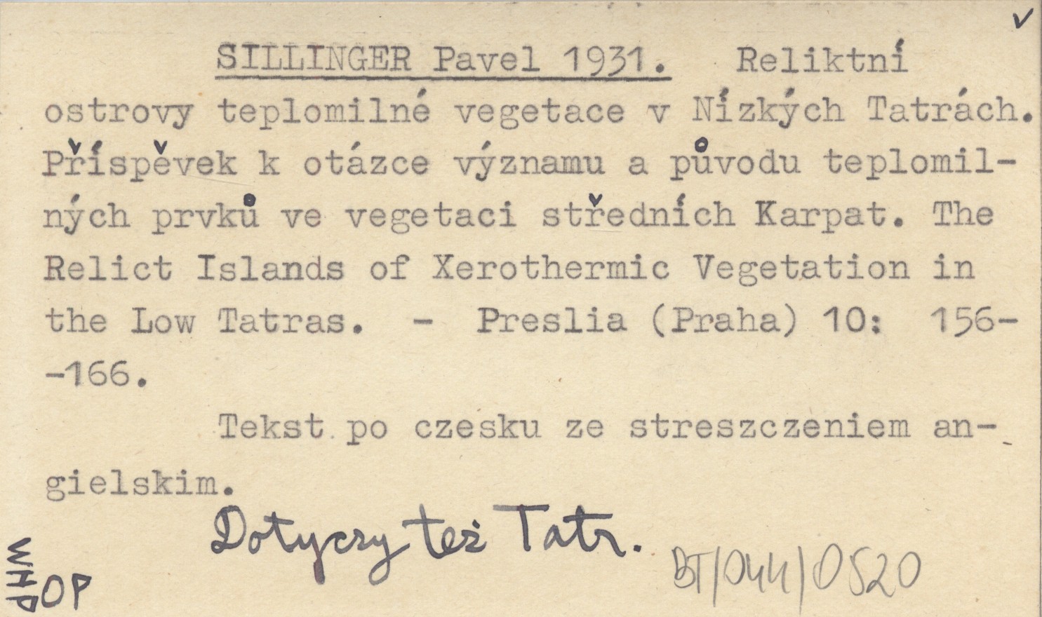 SILLINGER Pavel 1931 Reliktní ostrovy teplomilné vegetace v Nízkých Tatrách. Příspěvek k otázce významu a původu teplomilných prvků ve vegetaci středních Karpat. The Relict Islands of Xerothermic Vegetation in the Low Tatras.