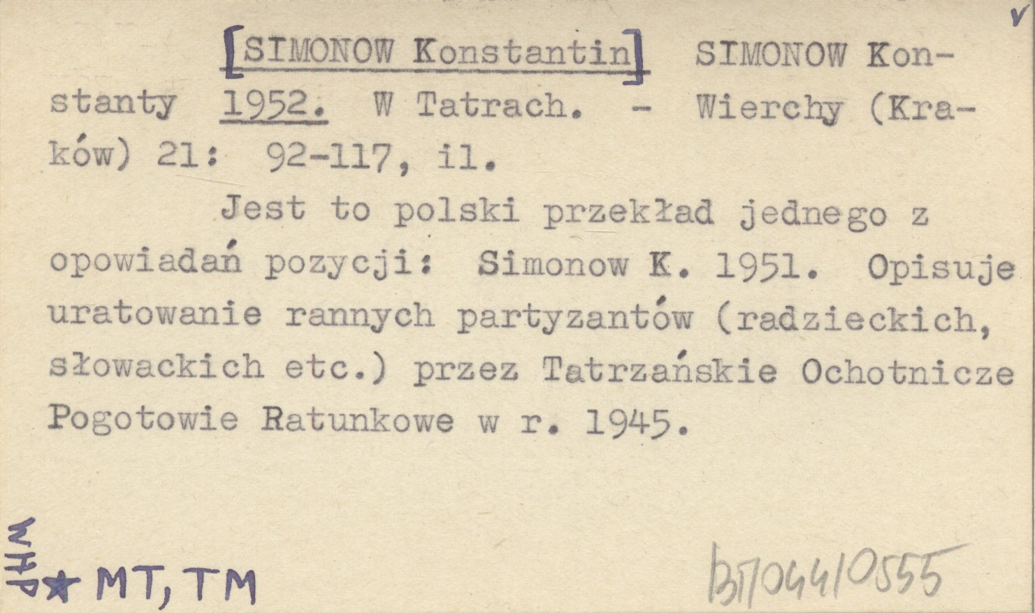Wierchy (Kraków) , 21: 92-117, il. Opisuje uratowanie rannych partyzantów (radzieckich, słowackich etc.) przez Tatrzańskie Ochotnicze Pogotowie Ratunkowe w r. 1945. Jest to polski przekład jednego z opowiadań pozycji: SIMONOW K. 1951.