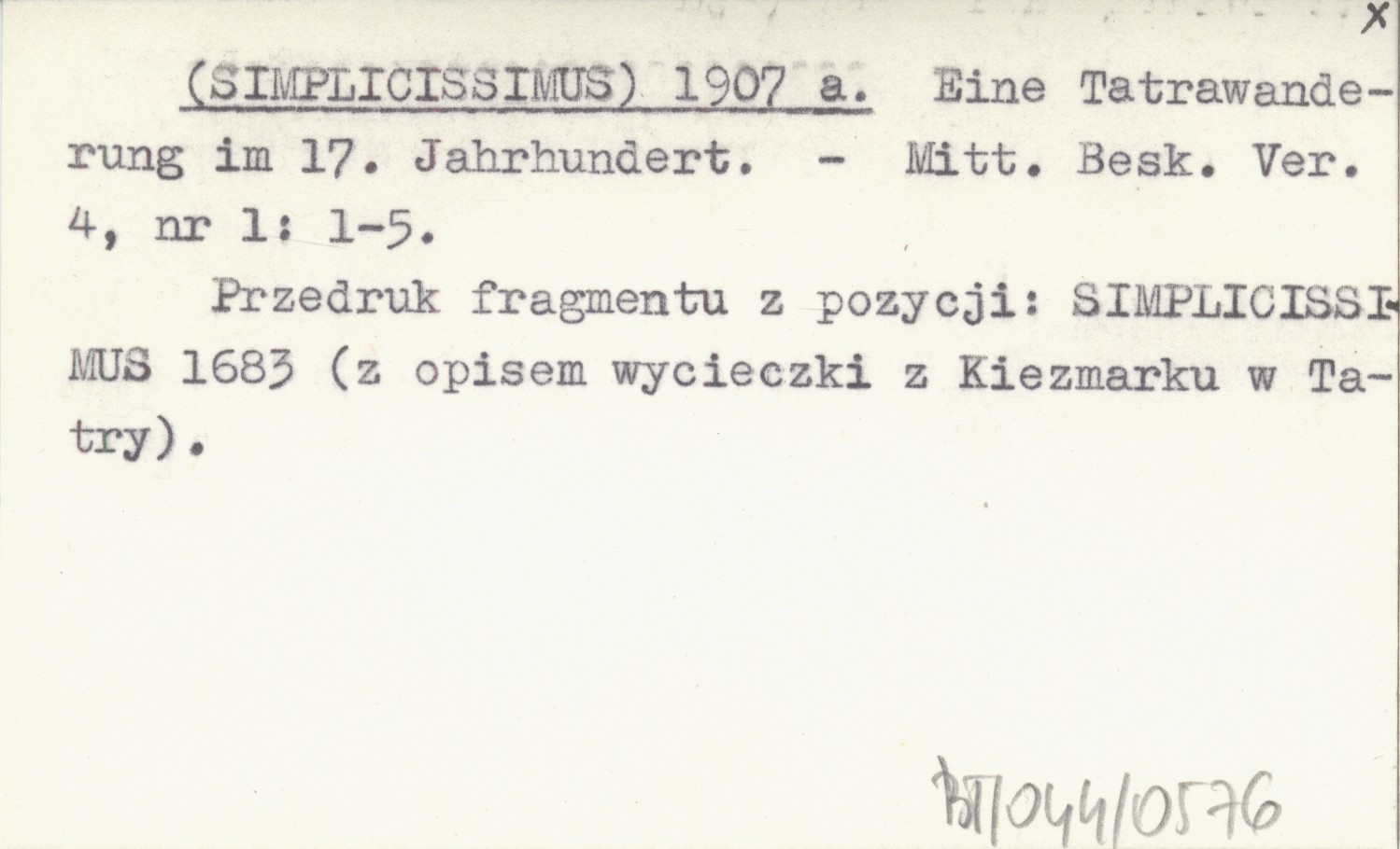 Mitteilungen des Beskidenvereines, 4, nr 1: 1-5. Przedruk fragmentu z pozycji: SIMPLICISSIMUS 1683 (z opisem wycieczki z Kiezmarku w Tatry).