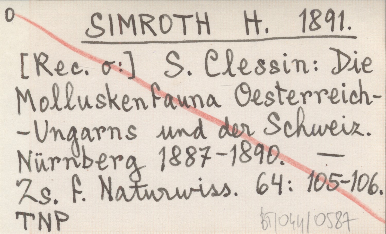 SIMROTH H. 1891 [Rec. o:] S. Clessin: Die Molluskenfauna Oesterreich-Ungarns und der Schweiz. Nürnberg 1887-1890.