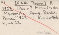 R. [SINKO Tadeusz] 1927 [Rec. o:] Maria Czeska-Mączyńska: Dymy. Powieść. Poznań 1927.