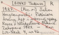 R [SINKO Tadeusz] 1927 [Rec. o:] Julian Krzyżanowski: Pieśniarz krainy kęp i wiecznej nędzy. Rzecz o Władysławie Orkanie. Zakopane 1927.