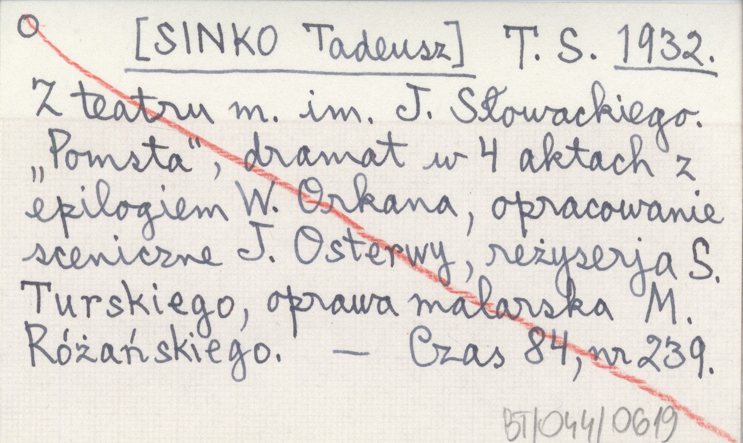 T. S. [SINKO Tadeusz] 1932 Z teatru m. im. J. Słowackiego. "Pomsta", dramat w 4 aktach z epilogiem W. Orkana, opracowanie sceniczne J. Osterwy, reżyserja S. Turskiego, oprawa malarska M. Różańskiego.