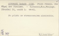 SITOWSKI Ludwik 1916 Ptaki Pienin. Die Vögel der Pieninen.
