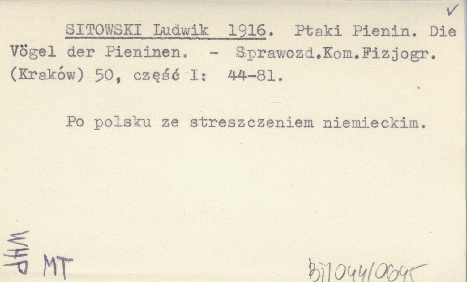 SITOWSKI Ludwik 1916 Ptaki Pienin. Die Vögel der Pieninen.