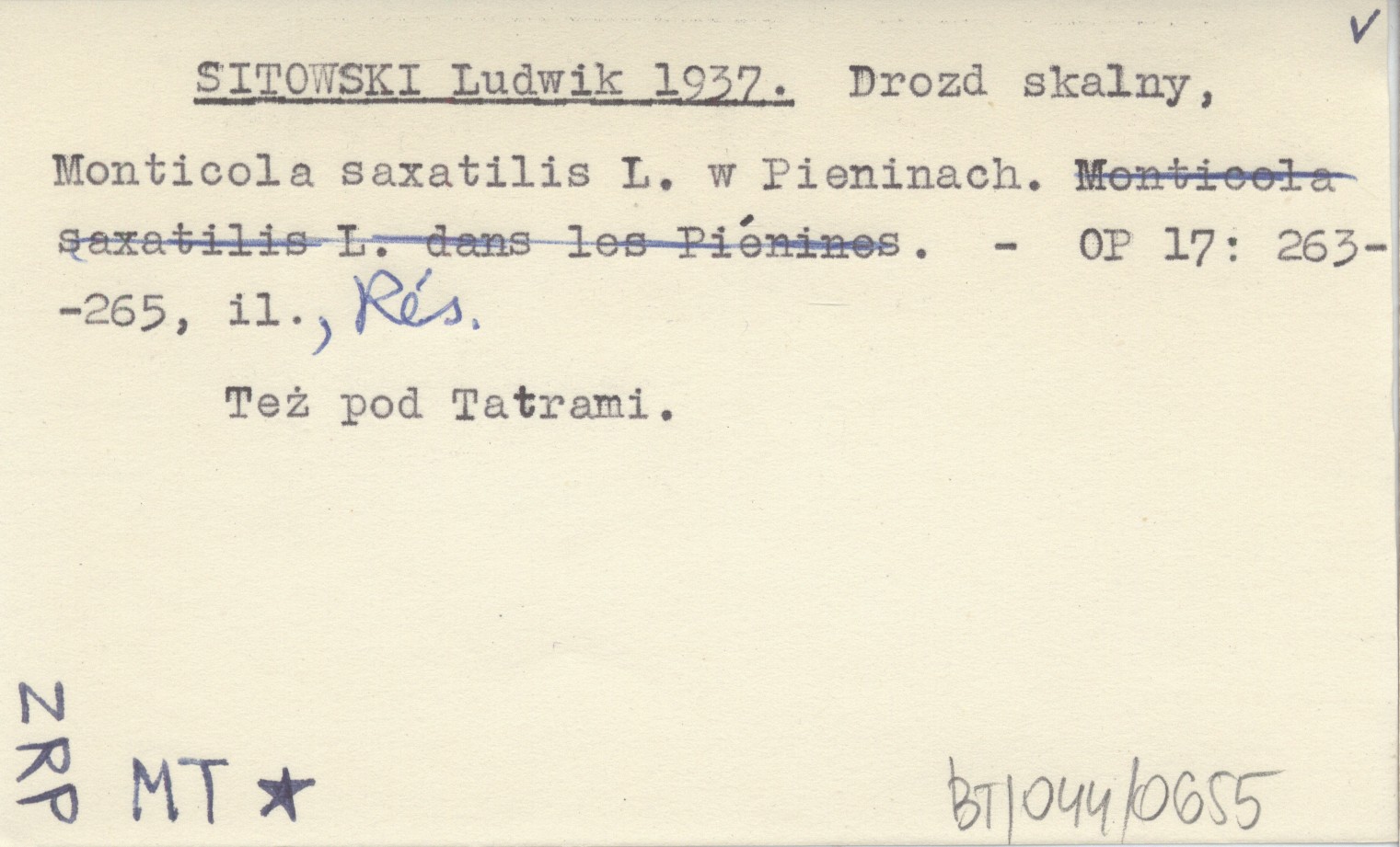 SITOWSKI Ludwik 1937 Drozd skalny, Monticola saxatilis L. w Pieninach.