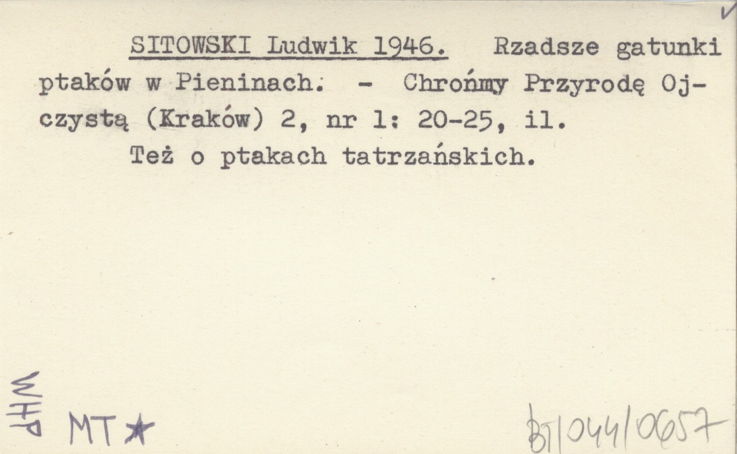 SITOWSKI Ludwik 1946 Rzadsze gatunki ptaków w Pieninach.