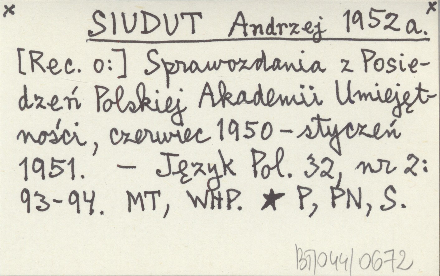 SIUDUT Andrzej 1952 a [Rec. o:] Sprawozdania z Posiedzeń Polskiej Akademii Umiejętności, czerwiec 1950 - styczeń 1951.