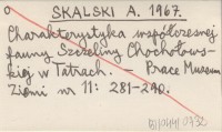 SKALSKI A. 1967 Charakterystyka współczesnej fauny Szczeliny Chochołowskiej w Tatrach.