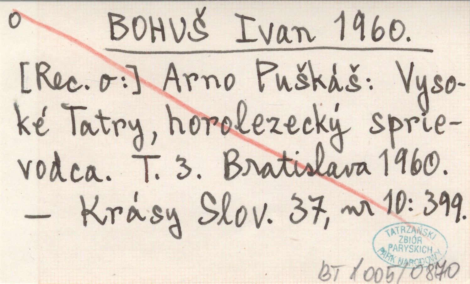 BOHUŠ Ivan 1960 [Rec. o:] Arno Puškáš: Vysoké Tatry, horolezecký sprievodca. T. 3. Bratislava 1960.