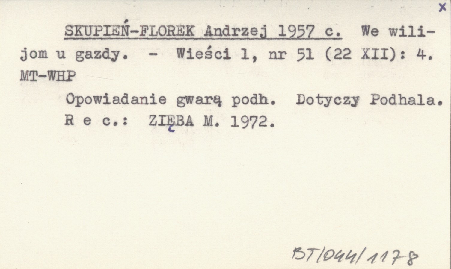 Wieści, 1, nr 51 (22 XII): 4. Opowiadanie gwarą podhalańską. Dotyczy Podhala. REC: ZIĘBA M. 1972