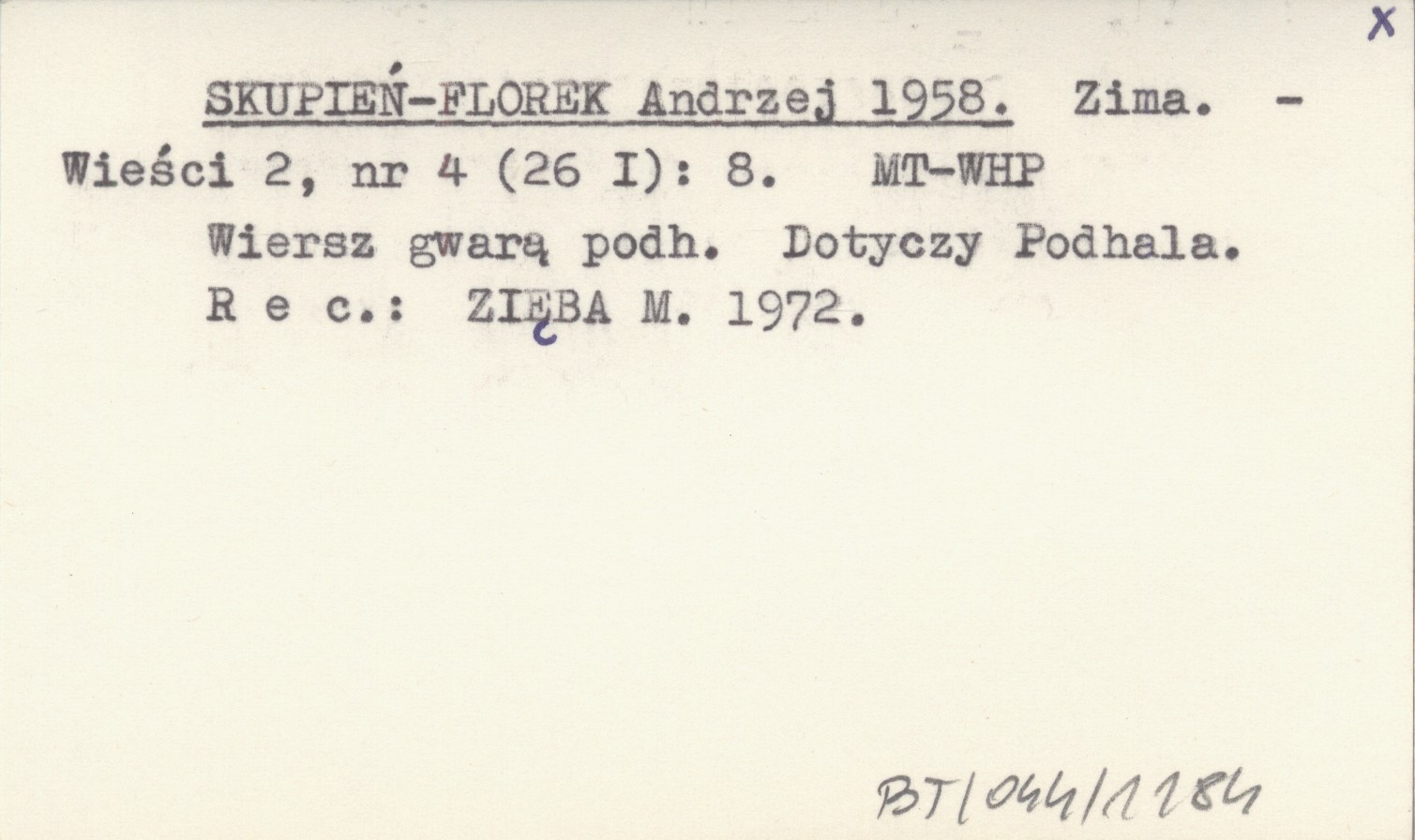 Wieści, 2, nr 4 (26 I): 8. Wiersz gwarą podhalańską. Dotyczy Podhala. REC: ZIĘBA M. 1972