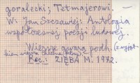 Jan Szczawiej: Antologia współczesnej poezji ludowej. , Wiersze gwarą podhalańską (z wyjątkiem wiersza Chlebne kłosy). REC: ZIĘBA M. 1972