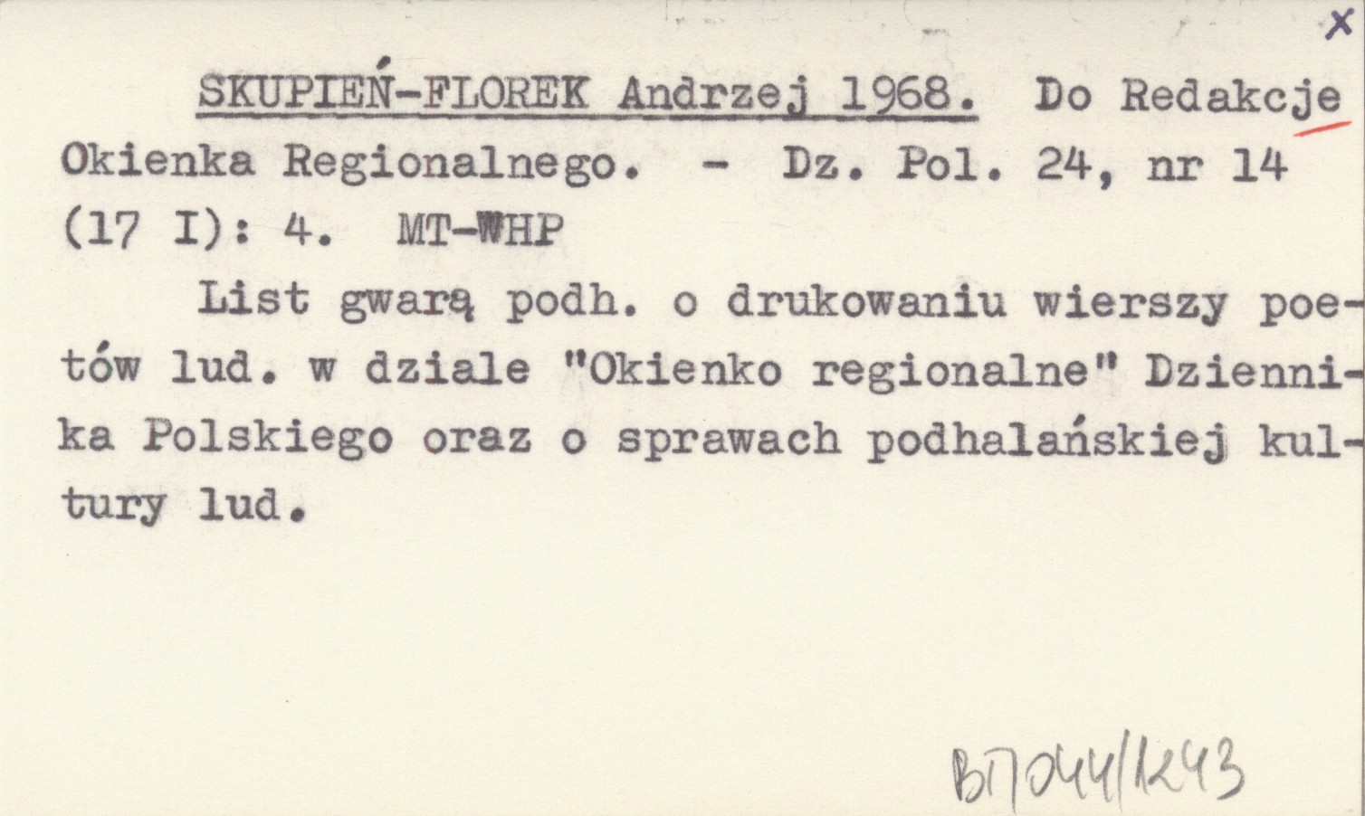 Dziennik Polski, 24, nr 14 (17 I): 4. List gwarą podhalańską o drukowaniu wierszy poetów ludowych w dziele "Okienko regionalne" Dziennika Polskiego oraz o sprawach podhalańskiej kultury ludowej.