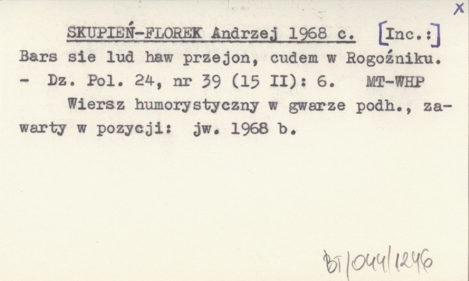 SKUPIEŃ-FLOREK Andrzej 1968 c [Inc.:] Bars sie lud haw przejon, cudem w Rogoźniku.
