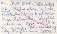 SKUPIEŃ-FLOREK Andrzej 1967 Chlebne kłosy ; Do Orła ; Elektryka ; Kieby jo był poetom ; Moja chałupecka ; Moja pieśń codzienna ; Moja wieś ; O Tatry wy moje ; Podhalańskie my syny ; Przy koszeniu ; Śwarne goralecki ; Tetmajerowi.