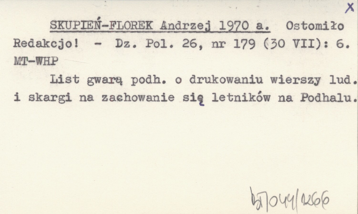 Dziennik Polski, 26, nr 179 (30 VII): 6. List gwarą podhalańską o drukowaniu wierszy ludowych i skargi na zachowanie się letników na Podhalu.