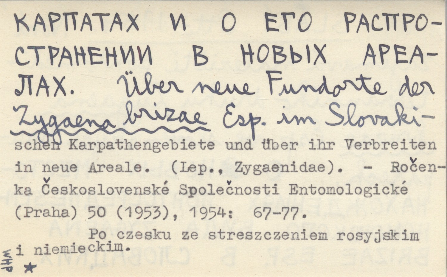 SLABĘ Otto 1954 Nová zajímavá nalezičtì pontomediterranního druhu Zygaena brizae Esp. ve slovenskęch Karpatech. O novych mestonachoŸdenijach pontosrediezemnomorskogo vida Zygaena brizae Esp. v slovackich Karpatach i o ego rasprostranenii v novych arealach. Über neue Fundorte der Zygaena brizae Esp. im Slovakischen Karpathengebiete und über ihr Verbreiten in neue Areale. (Lep. Zygaenidae).
