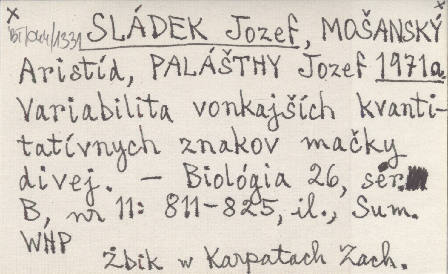 SLÁDEK Jozef MOŠANSKÝ, Aristíd. ; PALÁŠTHY, Jozef. ; 1971 a Variabilita vonkajších kvantitatívnych znakov mačky divej.