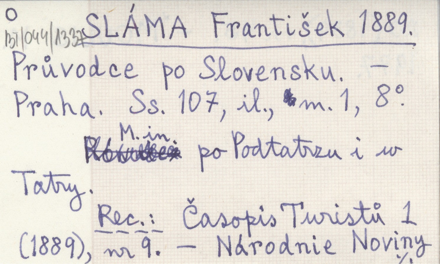 Praha , 107 s., il., 1 mapa, 8°. M. in. po Podtatrzu i w Tatry. REC: Časopis Turistů 1 (1889), nr 9 ; Národnie Noviny 20 (1889), nr 45 ; MOULIS M. 1977 ;