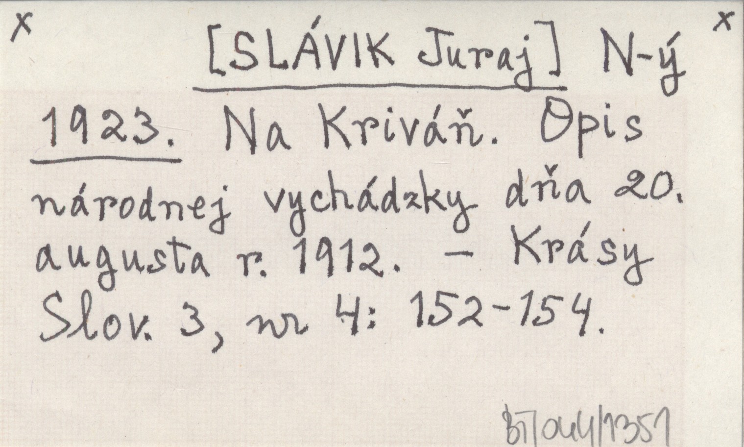 N-ý [SLÁVIK Juraj] 1923 Na Kriváň. Opis národnej vychádzky dňa 20. augusta r. 1912.