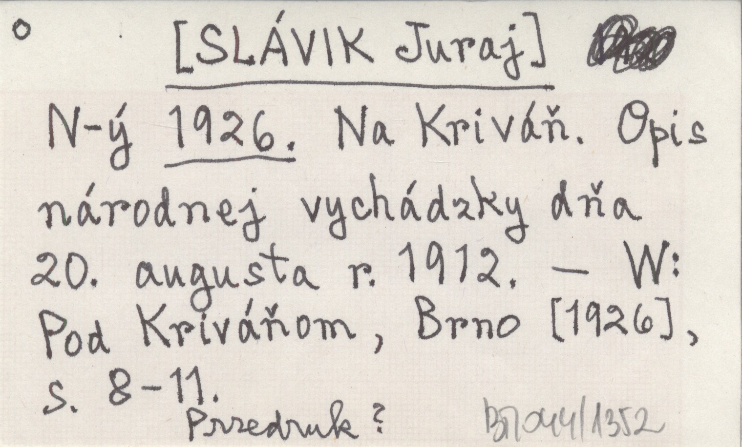 N-ý [SLÁVIK Juraj] 1926 Na Kriváň. Opis národnej vychádzky dňa 20. augusta r. 1912.
