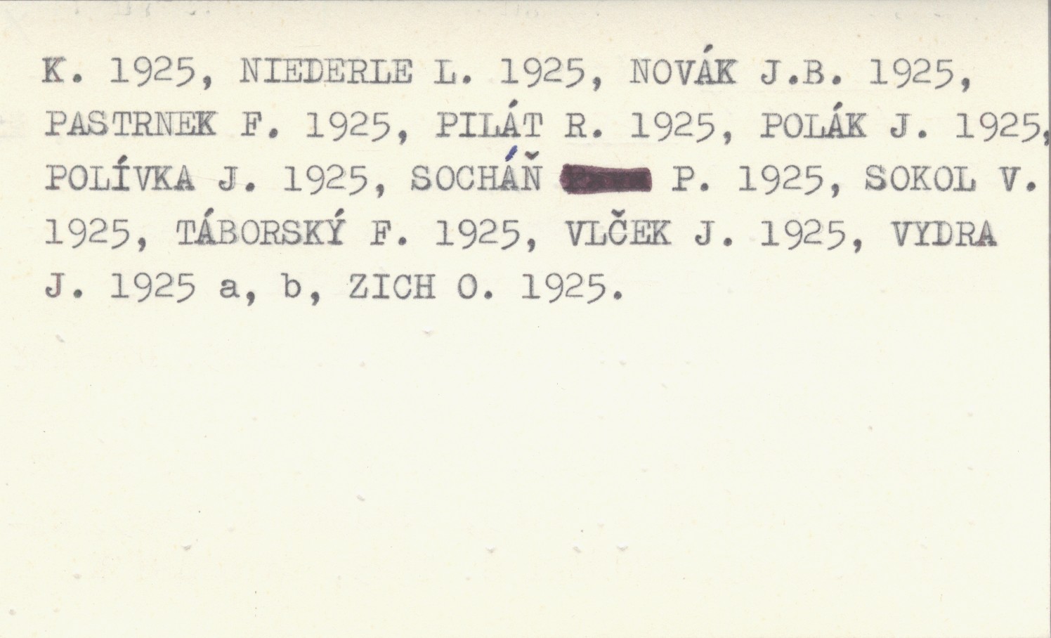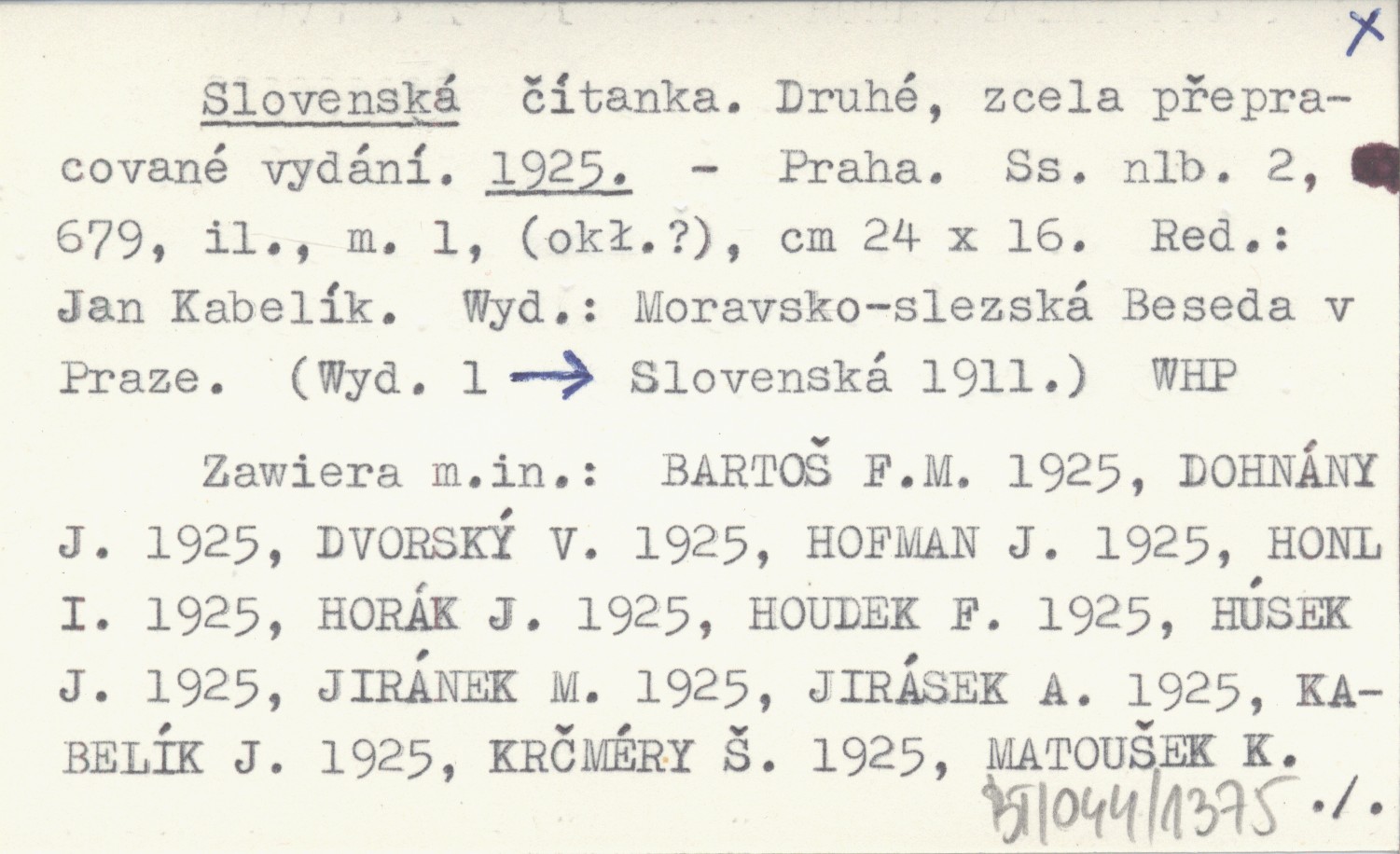 Zawiera m. in: BARTO© F. M. 1925, DOHNÁNY J. 1925, DVORSKÝ 1925, HOFMAN J. 1925, HONL I. 1925, HORÁK J. 1925, HOUDEK F. 1925, HÚSEK J. 1925, JIRÁNEK M. 1925, JIRÁSEK A. 1925, KABELÍK J. 1925, KRČMÉRY ©. 1925, MATOU©EK K. 1925, NIEDERLE L. 1925, NOVÁK J. B. 1925, PASTRNEK F. 1925, PILÁT R. 1925, POLÁK J. 1925, POLÍVKA J. 1925, SOCHÁŇ P. 1925, SOKOL V. 1925, TÁBORSKÝ F. 1925, VLČEK J. 1925, VYDRA J. 1925 a, b, ZICH O. 1925. Wyd. 1: Slovenská 1911.