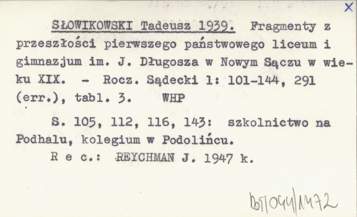 Rocznik Sądecki, 1: 101-144, 291 (err.), 3 k. S. 105, 112, 116, 143: szkolnictwo na Podhalu, kolegium w Podolińcu. REC: REYCHMAN J. 1947 k