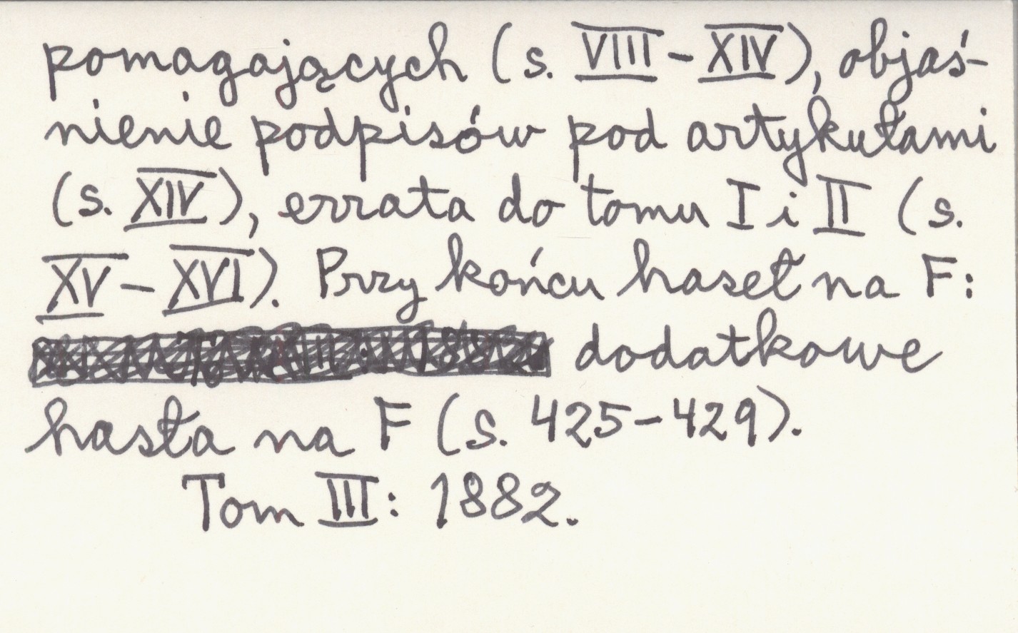 Warszawa , T. II, 927, XVI s., opr., 27x19 cm. Tom I: 1880. Zawartość tomu II: hasła Derenek-Gżack (s. 5-927), spis powiatów (s. I-VIII), lista osób pomagających (s. VIII-XIV), objaśnienie podpisów pod artykułami (s. XIV). Przy końcu haseł na F: hasła na F (s. 425-429). Tom III: 1882.