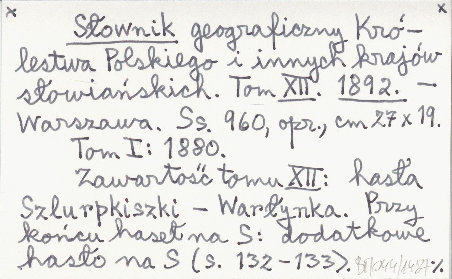 Warszawa , T. XII, 960 s., opr., 27x19 cm. Tom I: 1880. Zawartość tomu XII: hasła Szlurpkiszki-Warłynka. Przy końcu haseł na S: dodatkowe hasło na S (s. 132-133). Tom XIII: 1893.