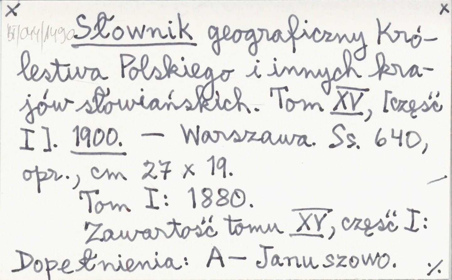 Warszawa , T. XV, cz. I, 640 s., opr., 27x19 cm. Tom I: 1880. Zawartość tomu XV, część I: Dopełnienia: A-Januszowo. Tom XV, część II: 1902.