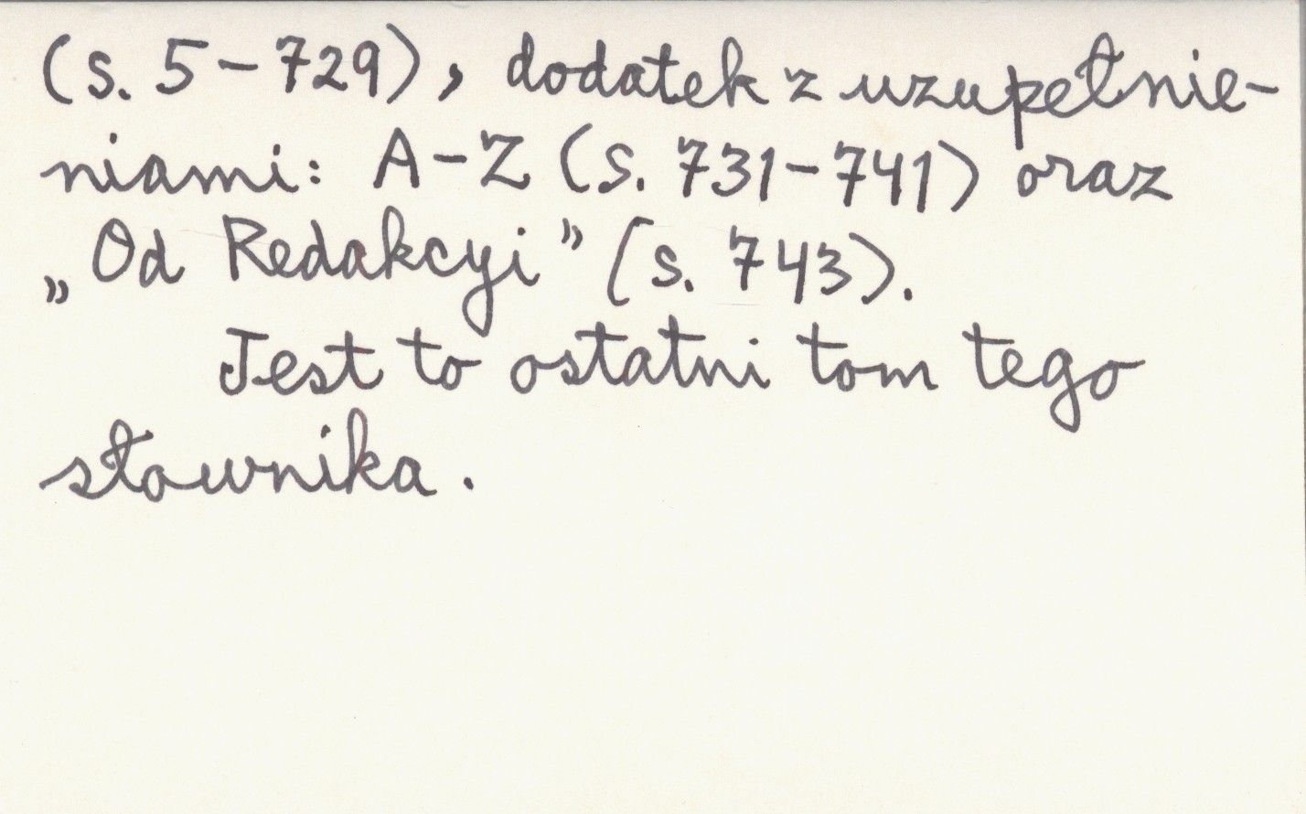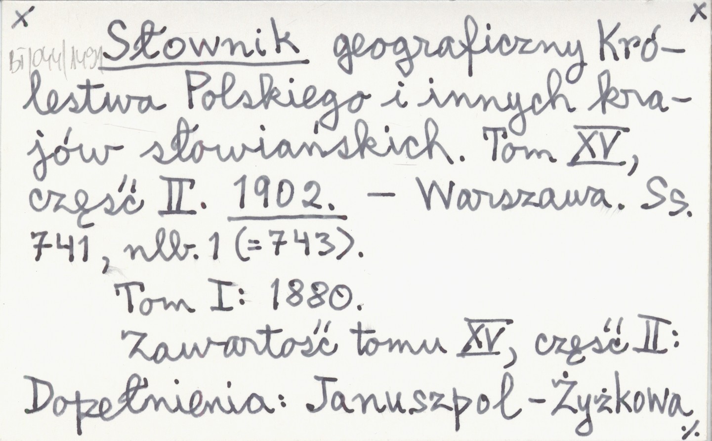 Warszawa , T. XV, cz. II, 741, [1] s. Tom I: 1880. Zawartość tomu XV, część II: Dopełnienia: Januszpol-Żyżkowa (s. 5-729), dodatek z uzupełnieniami: A-Z (s. 731-741) oraz "Od Redakcyi" (s. 743). Jest to ostatni tom tego słownika.
