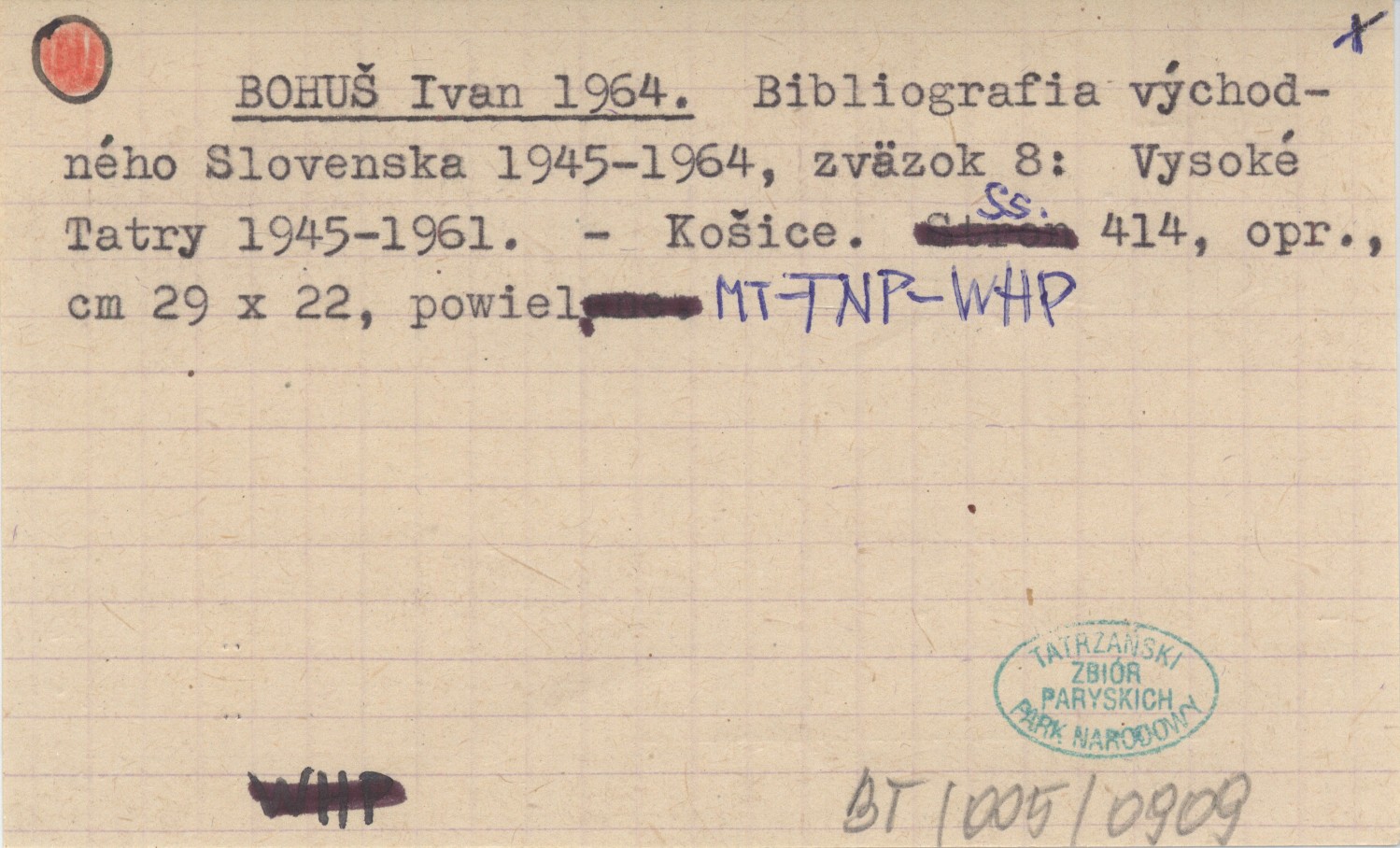 BOHUŠ Ivan 1964 Bibliografia východného Slovenska 1945-1964, zväzok 8: Vysoké Tatry 1945-1961.