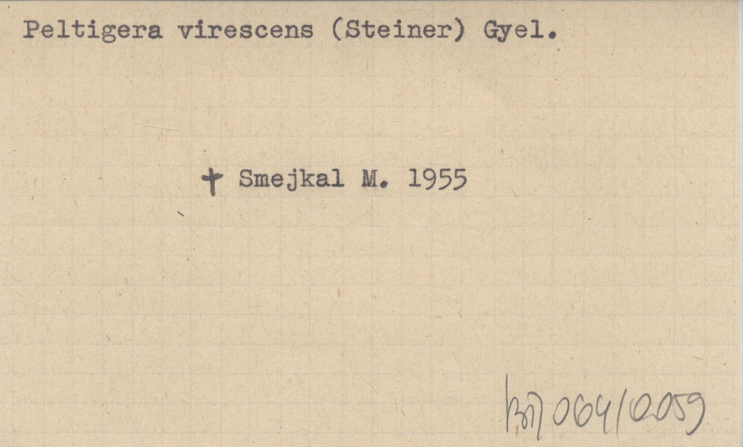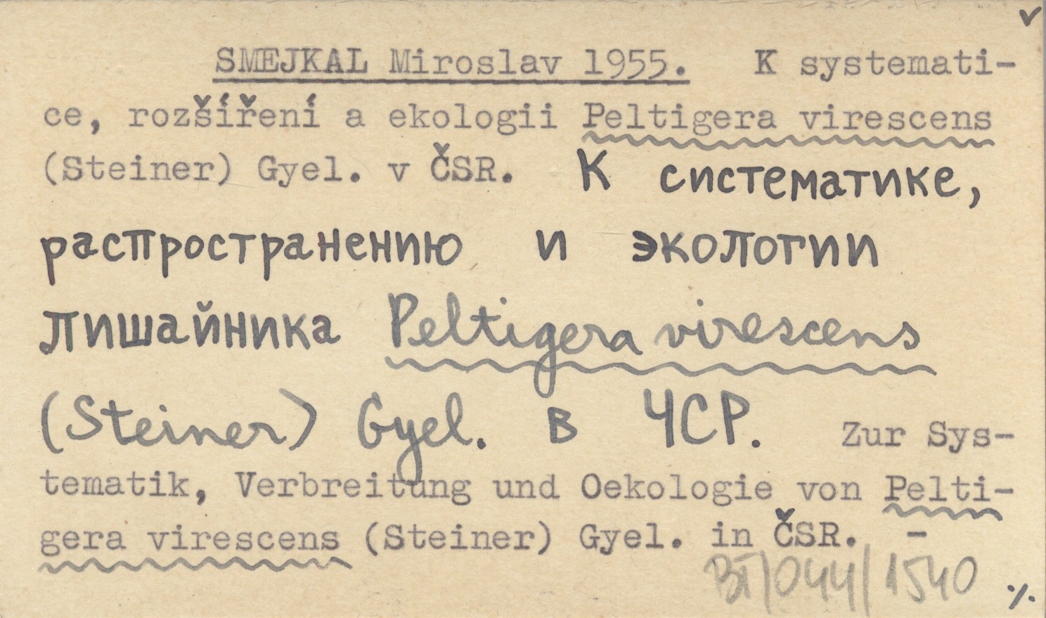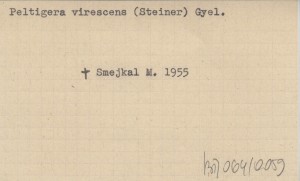 SMEJKAL Miroslav 1955 K systematice, rozšíření a ekologii Peltigera virescens (Steiner) Gyel. v ČSR. K sistematike, rasprostraneniju i ekologii lišajnika Peltigera virescens (Steiner) Gyel. v ČSR. Zur Systematik, Verbreitung und Oekologie von Peltigera virescens (Steiner) Gyel. in ČSR.