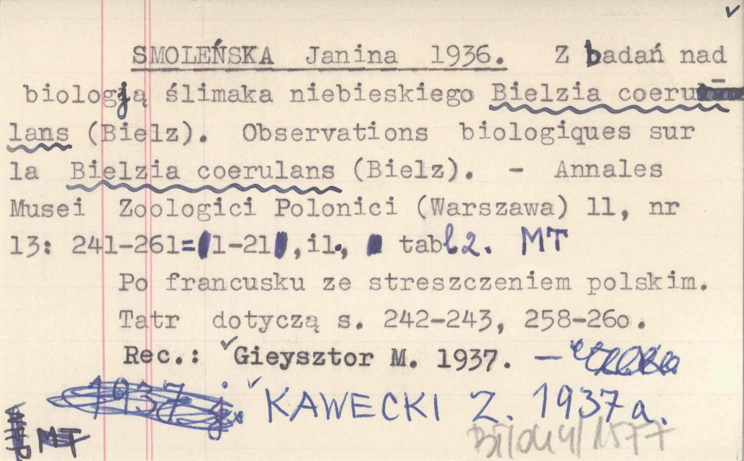SMOLEŃSKA Janina 1936 Z badań nad biologją ślimaka niebieskiego Bielzia coerulans (Bielz). Observations biologiques sur la Bielzia coerulans (Bielz).