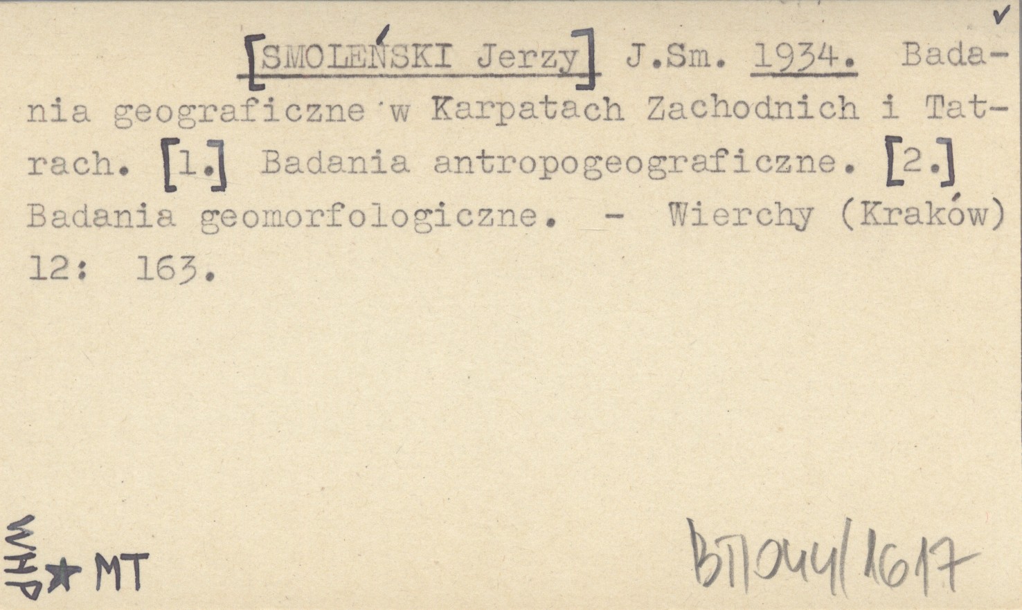 J. Sm. [SMOLEŃSKI Jerzy] 1934 Badania geograficzne w Karpatach Zachodnich i Tatrach. [1.] Badania antropogeograficzne. [2.] Badania geomorfologiczne.