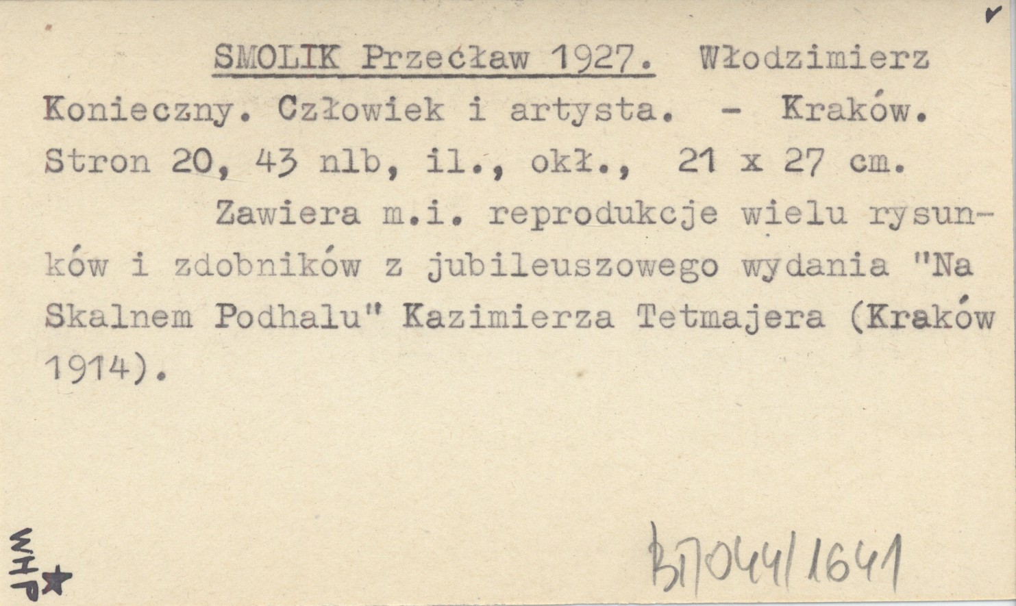 Kraków , 20, [43] s., il., okł., 21x27 cm. Zawiera m. in. reprodukcje wielu rysunków i zdobników z jubileuszowego wydania "Na Skalnem Podhalu" Kazimierza Tetmajera (Kraków 1914).