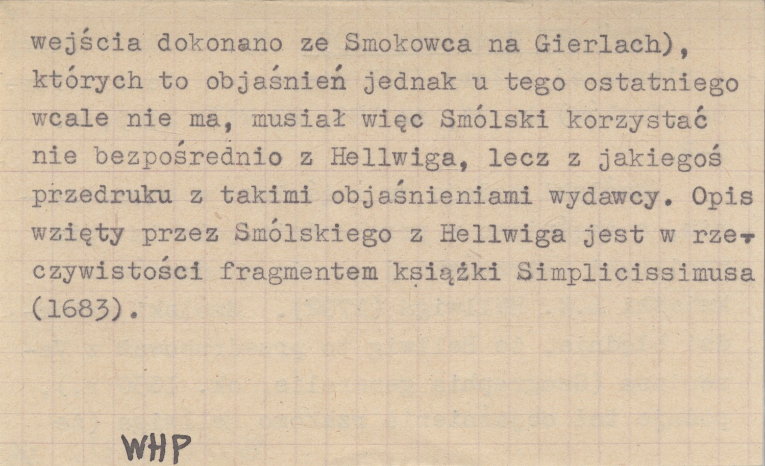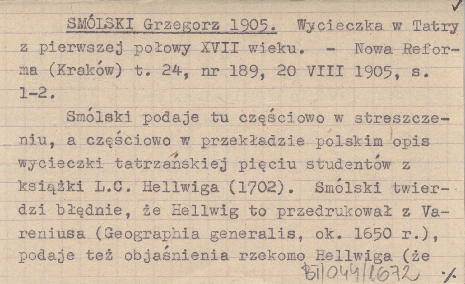 Nowa Reforma (Kraków) , T. 24, nr 189 (20 VIII 1905): 1-2. Smólski podaje tu częściowo w streszczeniu, a częściowo w przekładzie polskim opis wycieczki tatrzańskiej pięciu studentów z książki L. C. Hellwiga (1702). Smólski twierdzi błędnie, że Hellwig to przedrukował z Vareniusa (Geographia generalis, ok. 1650 r.), podaje też objaśnienia rzekomo Hellwiga (że wejścia dokonano ze Smokowca na Gierlach), których to objaśnień jednak u tego ostatniego wcale nie ma, musiał więc Smólski korzystać nie bezpośrednio z Hellwig, lecz z jakiegoś przedruku z takimi objaśnieniami wydawcy. Opis wzięty przez Smólskiego z Hellwiga jest w rzeczywistości fragmentem książki Simplicissimusa (1683).