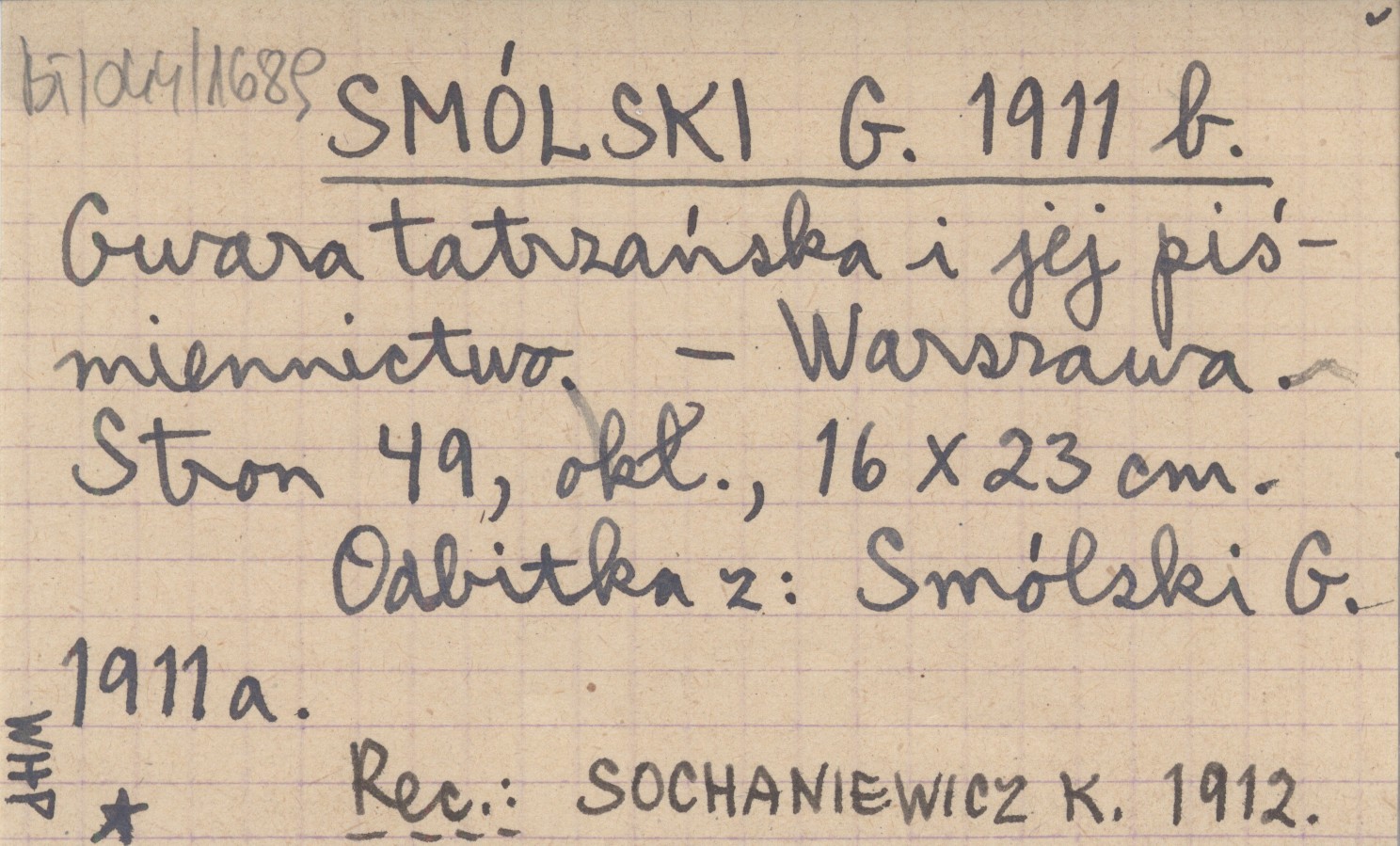 Warszawa , 49 s., okł., 16x23 cm. Odbitka z: SMÓLSKI G. 1911 a. REC: SOCHANIEWICZ K. 1912