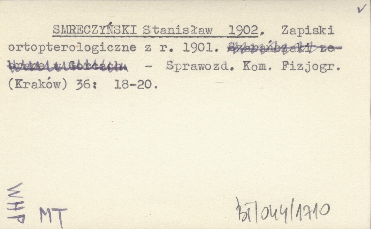 SMRECZYŃSKI Stanisław 1902 Zapiski ortopterologiczne z r. 1901.