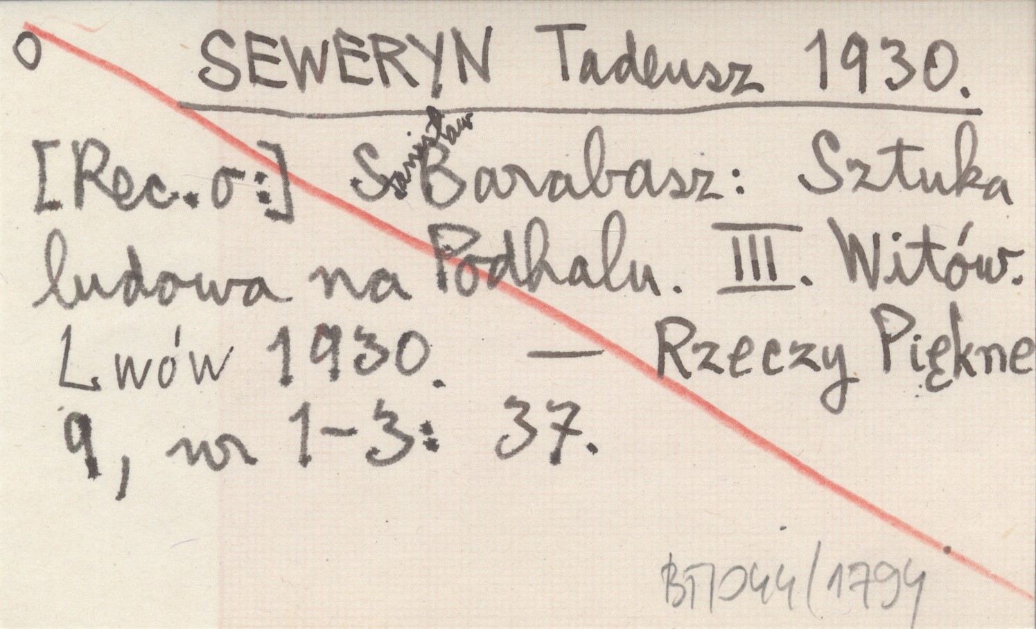 SEWERYN Tadeusz 1930 [Rec. o:] Stanisław Barabasz: Sztuka ludowa na Podhalu. III. Witów. Lwów 1930.