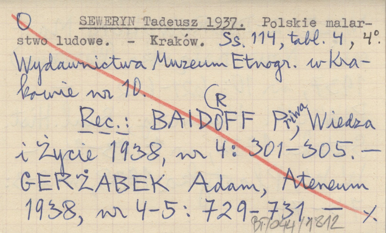 Muzeum Etnograficzne w Krakowie, Kraków (Wydawnictwa Muzeum Etnograficznego w Krakowie, nr 10) , 114 s., 4 k., 4°. REC: BAIDORFF Priwa, Wiedza i Życie 1938, nr 4: 301-305 ; GERŻABEK Adam, Ateneum 1938, nr 4-5: 729-731 ; NAŁĘCZ-DOBROWOLSKI Marceli, Nowa Książka (Warszawa) 1937, nr 10: 621-622 ; PIWOCKI Ksawery, Biuletyn Historii Sztuki 1938, nr 1: 93-96 ; W. W., Plastyka 1938, nr 2-3: 73-74 ;
