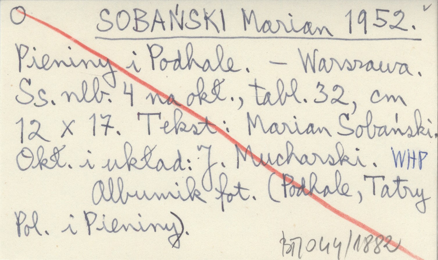 Warszawa , [4] s., 32 k., 12x17 cm. Albumik fotograficzny (Podhale, Tatry Polskie i Pieniny). Tekst: Marian Sobański. Okładka i układ: J. Mucharski.