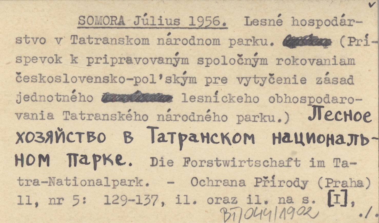 SOMORA Július 1956 Lesné hospodárstvo v Tatranskom národnom parku. (Príspevok k pripravovaným spoločným rokovaniam československo-poµským pre vytyčenie zásad jednotného lesníckeho obhospodarovania Tatranského národného parku). Lesnoe chozjajstvo v Tatranskom nacional'nom parke. Die Forstwirtschaft im Tatra-Nationalpark.