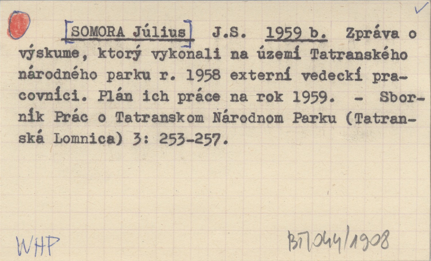 J. S. [SOMORA Július] 1959 b Zpráva o výskume, ktorý vykonali na území Tatranského národného parku r. 1958 externí vedeckí pracovníci. Plán ich práce na rok 1959.