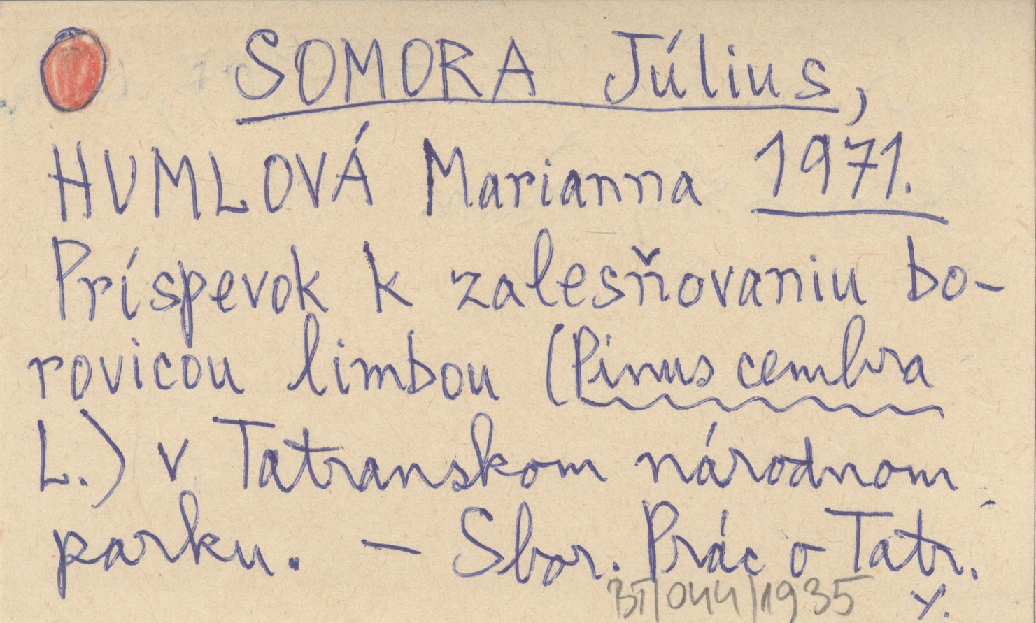 SOMORA Július HUMLOVÁ, Marianna. ; 1971 Príspevok k zalesňovaniu borovicou limbou (Pinus cembra L.) v Tatranskom národnom parku.