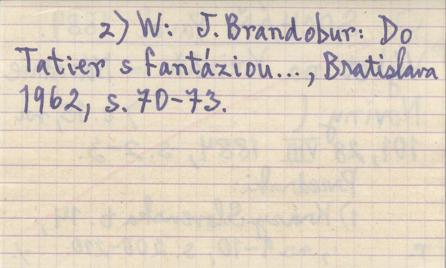 Národnie Noviny, T. 15, nr 101 (28 VIII 1884): 2-3. Przedruki: 1) Krásy Slovenska t. 14, nr 9-10: 208-210. 2) W: J. Brandobur: Do Tatier s fantáziou..., Bratislava 1962: 70-73.